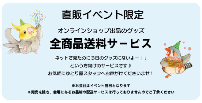 そこで、今回のイベントではゆとり屋のオンラインショップ(公式・minne・Yahoo)で販売中の商品でイベント会場にないものにつきましては送料サービスにてご注文を承ります!