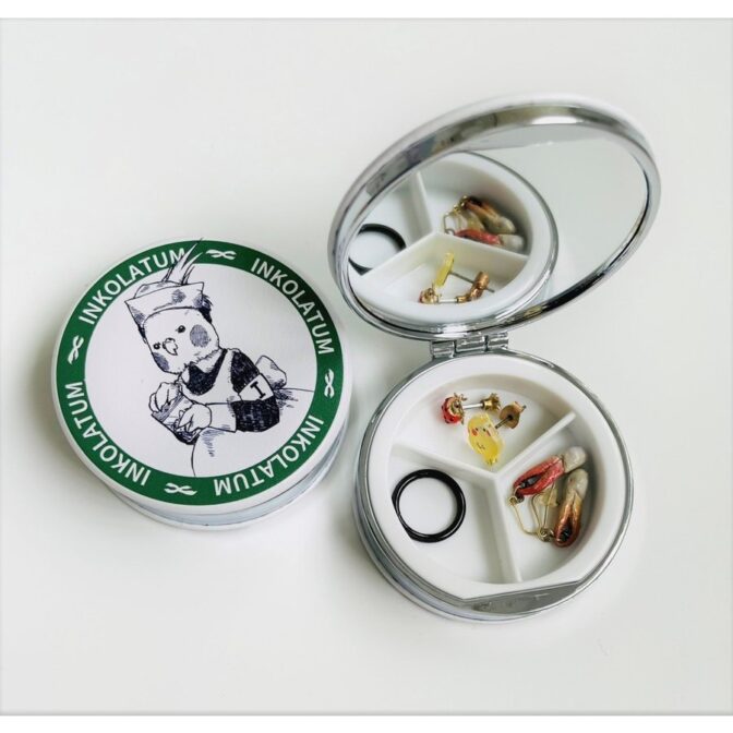 両面プリントなので、どっちから見てもかわいいのが嬉しいポイント♪中には仕切りがついているので、朝・昼・夜のお薬を分けて入れることもできます。旅行用のアクセサリー収納にもピッタリです。ミラー付きで、エチケットチェックにも便利です!