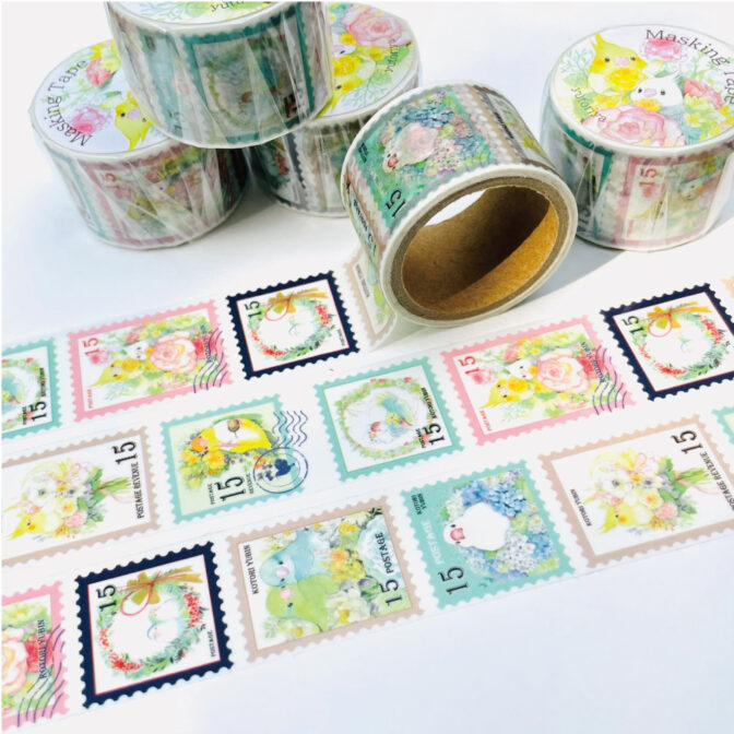 綺麗なブーケとかわいい小鳥たちを切手風のデザインのマステに仕上げました。